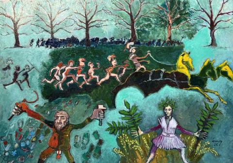 Le totalitarisme médaillé ou la paix des champs de blé. Les invasions et leurs exodes à pied avril 2026 Peinture à l'huile 65X92 Sociétal